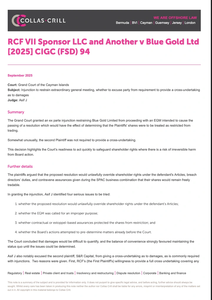 In a decisive ruling, the Cayman Islands Grand Court granted an injunction restraining Blue Gold from proceeding with an Extraordinary General Meeting (EGM) intended to pass a resolution that would restrict investor shares from trading. The Court found that there were serious legal questions as to whether Blue Gold’s actions violated shareholder protections and fiduciary obligations.