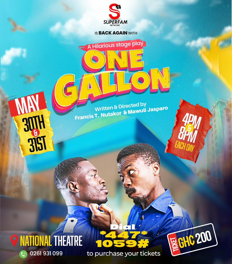 The clamour for a re-run of this artistic excellence has been long cried. Finally, SuperFam Network heeds this plea and stages ONE GALLON on 30th and 31st MAY at the National Theatre of Ghana. Time accommodates both early sleepers and late dwellers, afternoon – 4PM & evening – 8PM. The standard rate is a moderate GHC200.