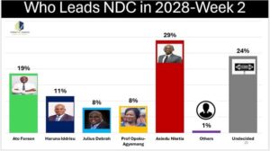In the latest figures, Asiedu Nketia secured 29 percent support, followed by Cassiel Ato Forson with 19 percent. Haruna Iddrisu polled 11 percent, while Julius Debrah and Naana Jane Opoku-Agyemang each recorded 8 percent.