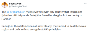 In a post shared on X (formerly Twitter), Mr. Ofori urged the AU to move beyond statements and adopt stricter measures, including severing ties with nations that officially or unofficially acknowledge Somaliland as an independent state.