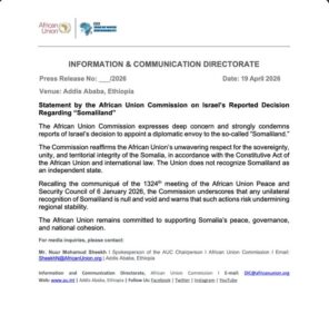 His comments follow a statement issued by the AU Commission on April 19, 2026, in Addis Ababa, where the continental body expressed deep concern and strongly condemned reports that Israel intends to appoint a diplomatic envoy to Somaliland.