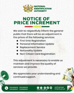 The new charges affect a range of services, including first-time registration, updates to personal information, replacement of the Ghana Card, changes to nationality status, and registration for non-citizen cards.