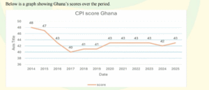 Ghana has recorded a marginal improvement in its performance on the global Corruption Perception Index (CPI), moving from a score of 42 in 2024 to 43 in the 2025 rankings.