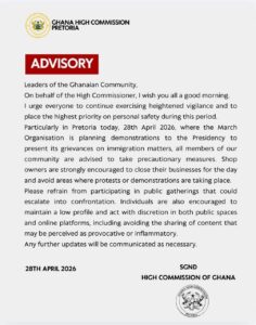 The Ghana High Commission in South Africa has urged Ghanaians residing in South Africa to remain vigilant and take precautionary measures ahead of planned demonstrations in Pretoria.
