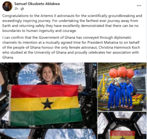 In a Facebook post on Sunday, April 12, the Minister for Foreign Affairs, Samuel Okudzeto Ablakwa, congratulated the Artemis II crew, describing the mission as both scientifically significant and deeply inspiring.