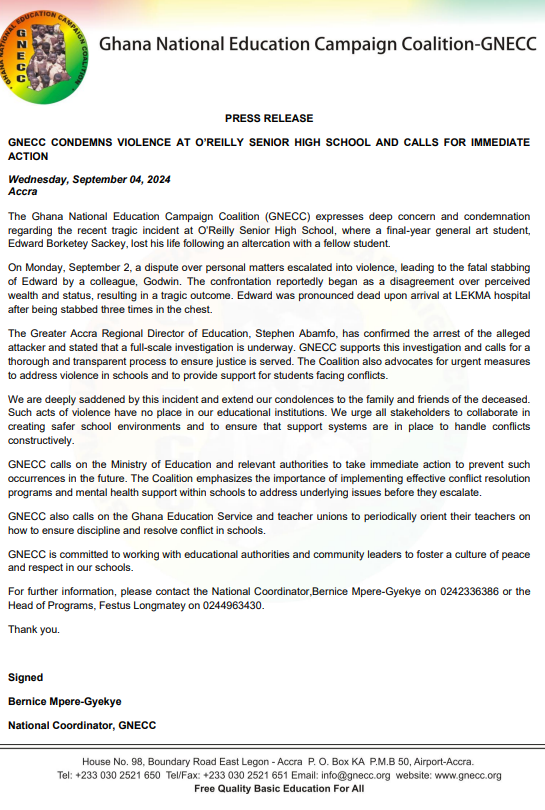 The coalition has also urged the Ministry of Education and relevant authorities to take immediate steps to prevent such occurrences in the future. GNECC emphasized the need for effective conflict resolution programs and mental health support within schools to address the underlying issues that often lead to such violent outcomes.
