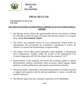 The Ministry explained that the facility was originally known as Accra International Airport before it was renamed, and authorities have now deemed it appropriate to restore its former and internationally recognised name.