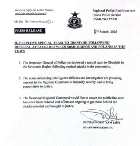 In a statement issued by the Ghana Police Service Regional Headquarters in Damongo on March 11, 2026, the police said the deployment was triggered by clashes between some Birifor and Fulani residents in the town.
