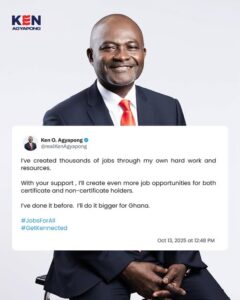 “I’ve created thousands of jobs through my own hard work and resources. With your support, I’ll create even more job opportunities for both certificate and non-certificate holders. I’ve done it before. I’ll do it bigger for Ghana,” Agyapong wrote.