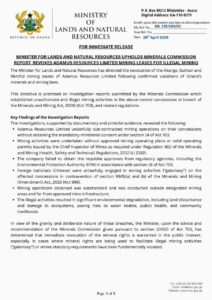 The government has withdrawn the mining leases of Adamus Resources Limited for its concessions at Akango, Salman, and Nkroful after investigations uncovered widespread regulatory violations and illegal mining activities.