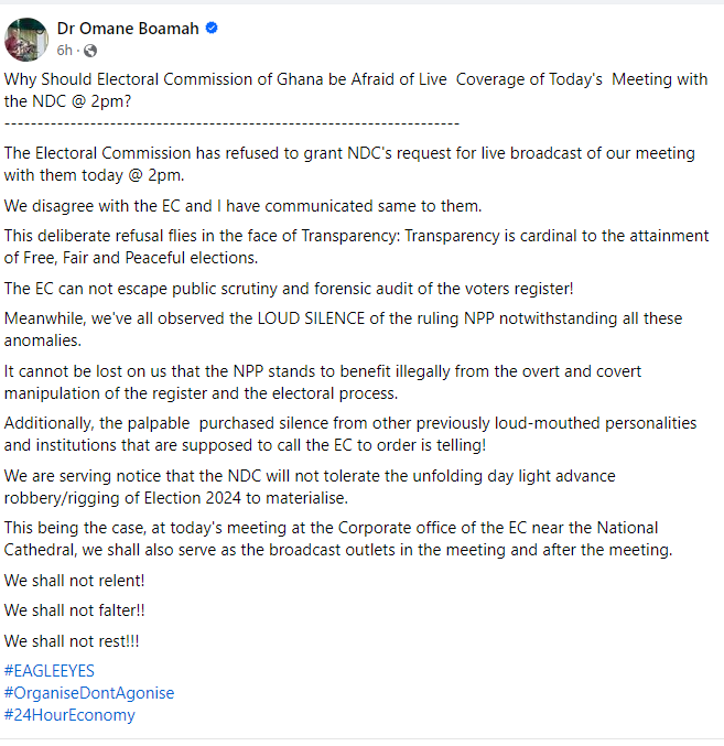 The National Democratic Congress (NDC) is pushing for transparency in its meeting with the Electoral Commission (EC) over the 2024 provisional voters register, announcing plans to livestream the discussion despite the EC’s refusal.