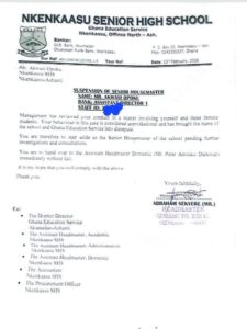 The management of Nkenkaasu Senior High School has suspended its Senior Housemaster, Akwasi Opoku, following allegations of misconduct involving three female students.