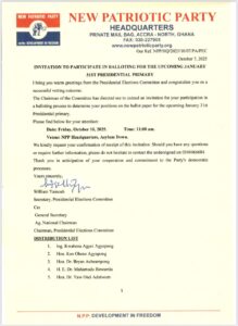 The invitation to participate in the balloting has been extended to all five qualified aspirants: Ing. Kwabena Agyei Agyepong, Hon. Ken Ohene Agyapong, Hon. Dr. Bryan Acheampong, former Vice President Dr. Mahamudu Bawumia, and Hon. Dr. Yaw Osei Adutwum.