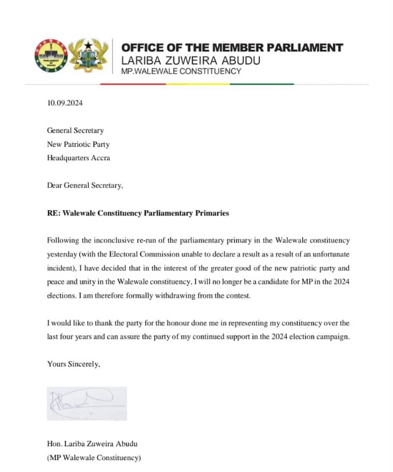 The Member of Parliament for Walewale, Lariba Abudu, has withdrawn from the New Patriotic Party (NPP) primaries in the constituency. This comes after the Electoral Commission (EC) annulled the primary contest between Abudu and Dr. Kabiru Mahama due to a ballot snatching incident.