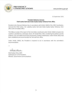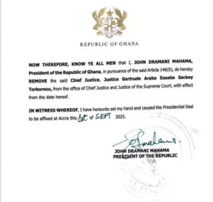 Chief Justice Gertrude Araba Esaaba Sackey Torkornoo has been officially removed from office by President John Dramani Mahama, in line with Article 146(9) of the 1992 Constitution.