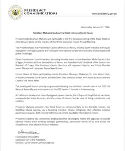 President John Dramani Mahama is set to chair the first Davos convening of the Accra Reset on January 22, on the margins of the World Economic Forum (WEF) Annual Meeting.