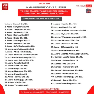 The company said the revised fares will apply to both its standard and executive coach services, covering major routes from Accra to key destinations across the country.