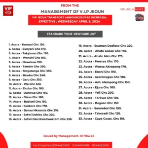 Under the new pricing structure, passengers using standard services will now pay GH¢120 from Accra to Kumasi, GH¢170 to Sunyani, and GH¢290 to Tamale. Fares to northern destinations have also been increased, with trips to Bolgatanga set at GH¢330 and Wa at GH¢320.